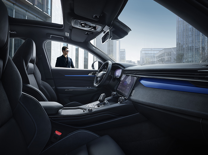 在内饰方面,领克05 PHEV延续领克全新设计语言,构建以驾驶者为中心的蔚蓝都市感官座舱。车内30道复杂工艺量身定制的海岸线真铝饰板,呈异于燃油版型的深蓝色质感,宛若天际蔚蓝海岸线,PHEV产品的与众不同得以精准呈现。北美头层NAPPA真皮、NUBUCK正绒面革等多种高端材质的运用,辅以蓝色双缝线工艺,将都市对立美学的极致追求凸显在车内细节之处,品质感不言而喻,赋予驾驶者视觉和触觉的双重豪华享受。