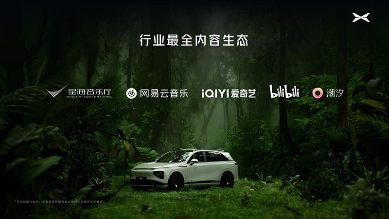 顶级的硬件配置、突破性的架构基础和软件技术并非全部。为了给用户带来真正的音乐厅级尊享体验,小鹏首次自研发阶段就与众多头部内容提供方深度合作,为Xopera小鹏音乐厅构建了行业最强内容生态。其中,星海音乐厅担任小鹏音乐厅战略艺术顾问,并为G9提供独家音乐内容资源。与网易云音乐联合定制包含众多专属原创曲目在内的杜比全景声曲库,让小鹏成为首个基于战略合作真正将可持续更新的杜比全景声曲库上车的车企。爱奇艺为小鹏打造了高品质全景声内容专区,并共同开发行业首个5D影院。与Bilibili联合定制杜比全景声原创视频专区,并打通美妆空间视频推送内容。此外,冥想模式下,联合潮汐App为小鹏G9提供定制立体声冥想音乐。基于丰富的高品质定制内容,小鹏G9为用户构建了视、听、享等丰富场景的强大内容生态,最大化发挥Xopera小鹏音乐厅的价值。