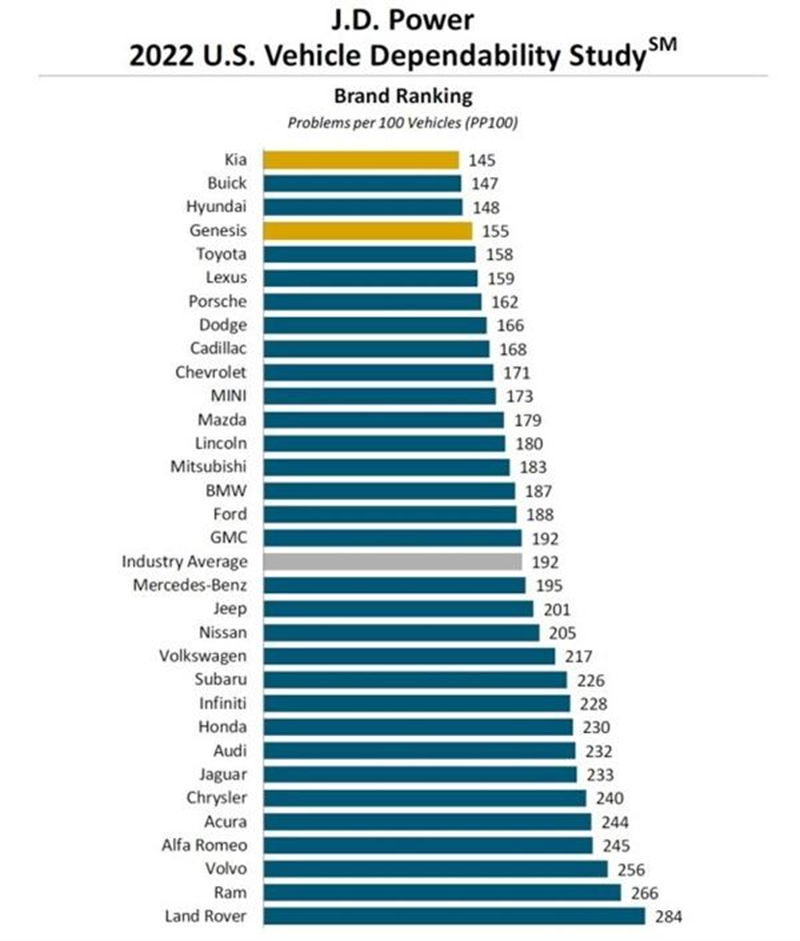 一、J.D.Power2022车辆可靠性研究出炉,起亚斩获最佳品牌奖