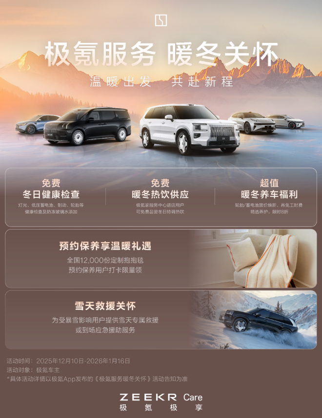 随着冬季来临,为保障广大车主安心出行,12月10日,极氪正式启动冬季服务关怀活动。此次关怀活动针对冬季用车特性与车主需求,聚焦雪天应急保障和暖冬养护,推出五大维度的全面服务方案。 应急保障方面,...