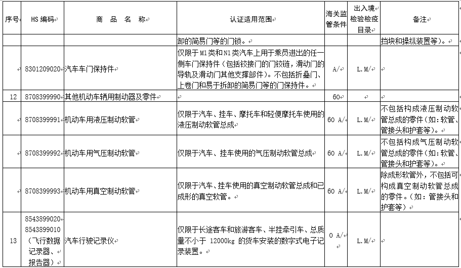 四、加强对列入目录内的机动车零部件产品的入境验证工作。各地出入境检验检疫机构对未经强制性产品认证且不符合特殊处理程序及免办规定的进口机动车零部件产品一律不予受理报检,并按照进口商品检验检疫规定要求其退货或者限期认证(见附件:实施强制性产品认证的机动车零部件产品HS编码,因HS编码每年均进行调整且各地海关对个别编码归类可能存在差异,附件所列编码仅供参考)。