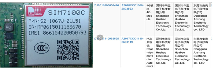 上述三种类型的行车记录仪,如额外增加移动通信功能(内置或插入手机卡,使用GSM/GPRS/WCDMA/4G等模式通信),可实现拨打电话、行驶轨迹实时跟踪、实时路况、上网等功能。这时,不论升级前产品是否属3C认证范围,原本归入0805类还是1110类,增加移动通信功能都会被视为主要功能,归类到3C目录中的“车载移动用户终端”产品(代码1606类),即使是“专为汽车….设计、制造和使用的、具有专门设计和安装结构”的也会被界定为车载移动终端,需要办理3C认证(例如绑带式、嵌入式行车记录仪)。但也有例外,因为1606类的认证范围还包括了通信模块(小型集成电路板),如果行车记录仪厂家直接采购经过了3C认证的移动通信模块用于组装生产(如下),则行车记录仪整机可无须认证,厂家也可以分别办理单纯后视镜和4G模块证书,组合成后视镜记录仪。